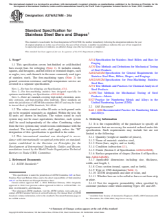 ASTM A276/A276M-24a is a technical specification published by ASTM International. Its full title is "Standard Specification for Stainless Steel Bars and Shapes". This standard covers: ABSTRACT This specification covers hot-finished or cold-finished bars except bars for reforging. It includes rounds, squares, and hexagons, and hot-rolled or extruded shapes, such as angles, tees, and channels in the more commonly used types of stainless steels. The bars shall be furnished in one of the following conditions: Condition A in which the bars are annealed, Condition H in which the bars are hardened and tempered at a relative temperature, Condition T in which the bars are hardened and tempered at a relatively high temperature, Condition S in which the bars are strain hardened or relatively light cold worked, and Condition B in which the bars are relatively severe cold worked. The material shall be subjected to a mechanical test to determine its tensile strength, yield strength, elongation, and Brinell hardness. SCOPE 1.1 This specification covers hot-finished or cold-finished bars except bars for reforging (Note 1). It includes rounds, squares, and hexagons, and hot-rolled or extruded shapes, such as angles, tees, and channels in the more commonly used types of stainless steels. The free-machining types (Note 2) for general corrosion resistance and high-temperature service are covered in a separate specification. Note 1: For bars for reforging, see Specification A314. Note 2: For free-machining stainless bars designed especially for optimum machinability, see Specification A582/A582M. Note 3: There are standards covering high nickel, chromium, austenitic corrosion, and heat-resisting alloy materials. These standards are under the jurisdiction of ASTM Subcommittee B02.07 and may be found in Annual Book of ASTM Standards, Vol. 02.04. 1.2 The values stated in either SI units or inch-pound units are to be regarded separately as standard. Within the text, the SI units are shown in brackets. The values stated in each system may not be exact equivalents; therefore, each system shall be used independently of the other. Combining values from the two systems may result in non-conformance with the standard. The inch-pound units shall apply unless the “M” designation of this specification is specified in the order. 1.3 This international standard was developed in accordance with internationally recognized principles on standardization established in the Decision on Principles for the Development of International Standards, Guides and Recommendations issued by the World Trade Organization Technical Barriers to Trade (TBT) Committee.