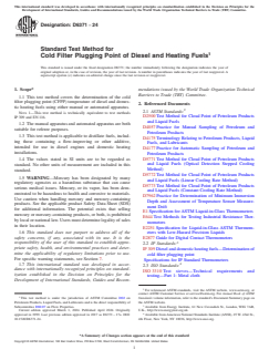 ASTM D6371-24: Standard Test Method for Cold Filter Plugging Point of Diesel and Heating Fuels provides an internationally recognized procedure for determining the cold filter plugging point (CFPP) of diesel fuels and domestic heating oils. Developed by ASTM International, this method helps estimate the lowest temperature at which these fuels will reliably flow through fuel systems, especially under low-temperature operating conditions. Trusted globally, ASTM D6371-24 supports quality control and product specification, aiding the fuel industry's compliance with technical regulations and end-user requirements.