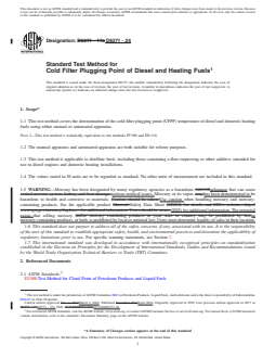 SIGNIFICANCE AND USE 5.1 The CFPP of a fuel is suitable for estimating the lowest temperature at which a fuel will give trouble-free flow in certain fuel systems. 5.2 In the case of diesel fuel used in European light duty trucks, the results are usually close to the temperature of failure in service except when the fuel system contains, for example, a paper filter installed in a location exposed to the weather or if the filter plugging temperature is more than 12 °C below the cloud point value in accordance with Test Method D2500, D5771, D5772, or D5773. Domestic heating installations are usually less critical and often operate satisfactorily at temperatures somewhat lower than those indicated by the test results. 5.3 The difference in results obtained from the sample as received and after heat treatment at 45 °C for 30 min can be used to investigate complaints of unsatisfactory performance under low temperature conditions. SCOPE 1.1 This test method covers the determination of the cold filter plugging point (CFPP) temperature of diesel and domestic heating fuels using either manual or automated apparatus. Note 1: This test method is technically equivalent to test methods IP 309 and EN 116. 1.2 The manual apparatus and automated apparatus are both suitable for referee purposes. 1.3 This test method is applicable to distillate fuels, including those containing a flow-improving or other additive, intended for use in diesel engines and domestic heating installations. 1.4 The values stated in SI units are to be regarded as standard. No other units of measurement are included in this standard. 1.5 WARNING—Mercury has been designated by many regulatory agencies as a hazardous substance that can cause serious medical issues. Mercury, or its vapor, has been demonstrated to be hazardous to health and corrosive to materials. Use caution when handling mercury and mercury-containing products. See the applicable product Safety Data Sheet (SDS) for additional information. The potential exists that selling mercury or mercury-containing products, or both, is prohibited by local or national law. Users must determine legality of sales in their location. 1.6 This standard does not purport to address all of the safety concerns, if any, associated with its use. It is the responsibility of the user of this standard to establish appropriate safety, health, and environmental practices and determine the applicability of regulatory limitations prior to use. For specific warning statements, see Section 7. 1.7 This international standard was developed in accordance with internationally recognized principles on standardization established in the Decision on Principles for the Development of International Standards, Guides and Recommendations issued by the World Trade Organization Technical Barriers to Trade (TBT) Committee.
