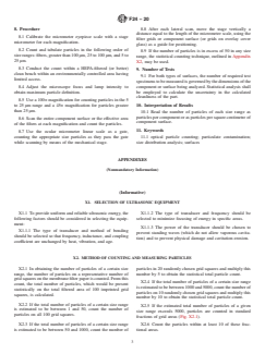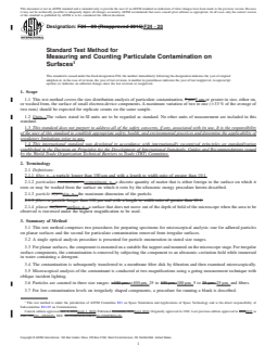 ABSTRACT This test method establishes the standard procedures for measuring and quantizing the size distribution of particulate contamination either on, or washed from, the surface of small electron-device components. The apparatuses and reagents required for this test are also enumerated herein. The number of required test specimens is governed by the dimensions of the component or surface being analyzed. Results shall be interpreted as particles per component or particles per square centimetre of component surface. SCOPE 1.1 This test method covers the size distribution analysis of particulate contamination, 5 μm or greater in size, either on, or washed from, the surface of small electron-device components. A maximum variation of two to one (±33 % of the average of two runs) should be expected for replicate counts on the same sample. 1.2 Units—The values stated in SI units are to be regarded as standard. No other units of measurement are included in this standard. 1.3 This standard does not purport to address all of the safety concerns, if any, associated with its use. It is the responsibility of the user of this standard to establish appropriate safety, health, and environmental practices and determine the applicability of regulatory limitations prior to use. 1.4 This international standard was developed in accordance with internationally recognized principles on standardization established in the Decision on Principles for the Development of International Standards, Guides and Recommendations issued by the World Trade Organization Technical Barriers to Trade (TBT) Committee.