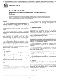 ASTM F24-20 is a standard published by ASTM International. Its full title is "Standard Test Method for Measuring and Counting Particulate Contamination on Surfaces". This standard covers: ABSTRACT This test method establishes the standard procedures for measuring and quantizing the size distribution of particulate contamination either on, or washed from, the surface of small electron-device components. The apparatuses and reagents required for this test are also enumerated herein. The number of required test specimens is governed by the dimensions of the component or surface being analyzed. Results shall be interpreted as particles per component or particles per square centimetre of component surface. SCOPE 1.1 This test method covers the size distribution analysis of particulate contamination, 5 μm or greater in size, either on, or washed from, the surface of small electron-device components. A maximum variation of two to one (±33 % of the average of two runs) should be expected for replicate counts on the same sample. 1.2 Units—The values stated in SI units are to be regarded as standard. No other units of measurement are included in this standard. 1.3 This standard does not purport to address all of the safety concerns, if any, associated with its use. It is the responsibility of the user of this standard to establish appropriate safety, health, and environmental practices and determine the applicability of regulatory limitations prior to use. 1.4 This international standard was developed in accordance with internationally recognized principles on standardization established in the Decision on Principles for the Development of International Standards, Guides and Recommendations issued by the World Trade Organization Technical Barriers to Trade (TBT) Committee.
