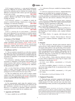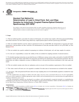 SIGNIFICANCE AND USE 5.1 This test method is intended for use with other standards that address the collection and preparation of samples (dusts by wipe, dried paint chips, and soils) that are obtained during the assessment or mitigation of lead hazards from buildings and related structures. 5.2 Laboratories analyzing samples obtained during the assessment or mitigation of lead hazards from buildings and related structures shall conform to Practice E1583, or shall be recognized for lead analysis as promulgated by authorities having jurisdiction, or both. Note 1: In the United States of America, laboratories performing analysis of samples collected during lead-based paint activities are required to be accredited to ISO/IEC 17025 and to other requirements promulgated by the Environmental Protection Agency (EPA). 5.3 This test method may also be used to analyze similar samples from other environments such as toxic characteristic extracts of waste sampled using Guide E1908 as prepared for analysis using EPA SW-846 Test Method 1311. SCOPE 1.1 This test method specifies a procedure for analysis of dried paint, soil, and dust wipe samples collected in and around buildings and related structures for lead content using inductively coupled plasma-optical emission spectroscopy (ICP-OES). 1.2 This test method should be used by analysts experienced in the use of ICP-OES, the interpretation of spectral and matrix interferences, and procedures for their correction. For determination of lead (Pb) and other metals in air by ICP-OES, see Test Method D7035. 1.3 This test method cites specific methods for preparing test solutions of dried paint, soil, and wipe samples for analysis. 1.4 It is the user’s responsibility to ensure the validity of this test method for sampling materials of untested matrices. 1.5 No detailed operating instructions are provided because of differences among various makes and models of suitable ICP-OES instruments. Instead, the analyst shall follow the instructions provided by the manufacturer of the particular instrument. This test method does not address comparative accuracy of different devices or the precision between instruments of the same make and model. 1.6 This test method contains notes that are explanatory and are not part of the mandatory requirements of this test method. 1.7 The values stated in SI units are to be regarded as standard. No other units of measurement are included in this standard. 1.7.1 Exception—The inch-pound and SI units shown for wipe sampling data are to be individually regarded as standard for wipe sampling data. 1.8 This standard does not purport to address all of the safety concerns, if any, associated with its use. It is the responsibility of the user of this standard to establish appropriate safety, health, and environmental practices and determine the applicability of regulatory limitations prior to use. 1.9 This international standard was developed in accordance with internationally recognized principles on standardization established in the Decision on Principles for the Development of International Standards, Guides and Recommendations issued by the World Trade Organization Technical Barriers to Trade (TBT) Committee.
