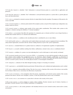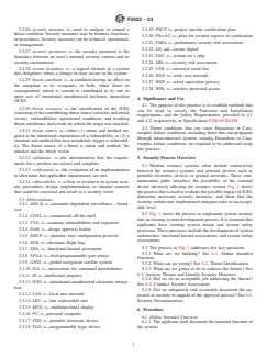 SIGNIFICANCE AND USE 4.1 The purpose of this practice is to establish methods that can be used to satisfy the Function and Installation requirements, and the Safety Requirements, provided in 4.1 and 4.2, respectively, in Specification F3061/F3061M. 4.2 Threat conditions that can cause Hazardous or Catastrophic failure conditions, including those that can propagate through interconnected systems causing Hazardous or Catastrophic failure conditions, are required to be addressed using this practice. SCOPE 1.1 This practice covers methods for addressing Aircraft System Information Security Protection (ASISP) risks caused by Intentional Unauthorized Electronic Interactions (IUEIs). This practice was developed considering Level 1, Level 2, Level 3, and Level 4 normal category aeroplanes. The content may be more broadly applicable. It is the responsibility of the applicant to substantiate broader applicability as a specific means of compliance. The topics covered within this practice are threat identification, identifying security measures, conducting a security risk assessment, and security documentation. 1.2 An applicant intending to use this practice as means of compliance for a design approval must seek guidance from their respective oversight authority (for example, published guidance from applicable civil aviation authority (CAA)) concerning the acceptable use and application thereof. For information on which oversight authorities have accepted this practice (in whole or in part) as an acceptable Means of Compliance to their regulatory requirements (hereinafter “the Rules”), refer to the ASTM Committee F44 web page (www.astm.org/COMMITTEE/F44.htm). 1.3 This standard does not purport to address all of the safety concerns, if any, associated with its use. It is the responsibility of the user of this standard to establish appropriate safety, health, and environmental practices and determine the applicability of regulatory limitations prior to use. 1.4 This international standard was developed in accordance with internationally recognized principles on standardization established in the Decision on Principles for the Development of International Standards, Guides and Recommendations issued by the World Trade Organization Technical Barriers to Trade (TBT) Committee.