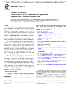 ASTM F3532-23 is a standard published by ASTM International. Its full title is "Standard Practice for Protection of Aircraft Systems from Intentional Unauthorized Electronic Interactions". This standard covers: SIGNIFICANCE AND USE 4.1 The purpose of this practice is to establish methods that can be used to satisfy the Function and Installation requirements, and the Safety Requirements, provided in 4.1 and 4.2, respectively, in Specification F3061/F3061M. 4.2 Threat conditions that can cause Hazardous or Catastrophic failure conditions, including those that can propagate through interconnected systems causing Hazardous or Catastrophic failure conditions, are required to be addressed using this practice. SCOPE 1.1 This practice covers methods for addressing Aircraft System Information Security Protection (ASISP) risks caused by Intentional Unauthorized Electronic Interactions (IUEIs). This practice was developed considering Level 1, Level 2, Level 3, and Level 4 normal category aeroplanes. The content may be more broadly applicable. It is the responsibility of the applicant to substantiate broader applicability as a specific means of compliance. The topics covered within this practice are threat identification, identifying security measures, conducting a security risk assessment, and security documentation. 1.2 An applicant intending to use this practice as means of compliance for a design approval must seek guidance from their respective oversight authority (for example, published guidance from applicable civil aviation authority (CAA)) concerning the acceptable use and application thereof. For information on which oversight authorities have accepted this practice (in whole or in part) as an acceptable Means of Compliance to their regulatory requirements (hereinafter “the Rules”), refer to the ASTM Committee F44 web page (www.astm.org/COMMITTEE/F44.htm). 1.3 This standard does not purport to address all of the safety concerns, if any, associated with its use. It is the responsibility of the user of this standard to establish appropriate safety, health, and environmental practices and determine the applicability of regulatory limitations prior to use. 1.4 This international standard was developed in accordance with internationally recognized principles on standardization established in the Decision on Principles for the Development of International Standards, Guides and Recommendations issued by the World Trade Organization Technical Barriers to Trade (TBT) Committee.