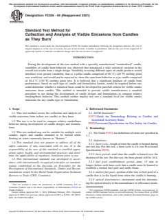 ASTM F2326-04(2021) is a standard published by ASTM International. Its full title is "Standard Test Method for Collection and Analysis of Visible Emissions from Candles as They Burn". This standard covers: SIGNIFICANCE AND USE 5.1 The intent of this test method is to aid the candle manufacturer to optimize candle formulations in the reduction of visible smoke emissions. 5.2 This test method is intended to provide candle manufacturers a standard procedure to use during development of candle designs and formulations to compare relative smoke/burn behavior. For the development of this method, a protocol was established for trimming the wick on specially prepared test candles to 6 mm to 7 mm (1/4 in.) prior to each burn cycle. It is recommended that the manufacturer determine a standardized protocol, that is, either not trimming the wick or trimming the wick to an appropriate length in order for direct comparison of results. 5.3 A relative ranking of candle formulations can be established with the use of a histogram of the data and control charts. 5.4 This test method is not intended to set forth pass/fail criteria for visible smoke emissions from candles, as such, this method sets no standard level for visible smoke emissions. SCOPE 1.1 This test method covers the collection and analysis of visible emissions from indoor use candles as they burn. 1.2 The test is to be used to compare relative smoke/burn behavior during development of candle designs and formulations. 1.3 This test method may not be suitable for multiple wick candles; tapers and candles intended to be burned while floating on water commonly known as “floaters.” 1.4 This standard does not purport to address all of the safety concerns, if any, associated with its use. It is the responsibility of the user of this standard to establish appropriate safety, health, and environmental practices and determine the applicability of regulatory limitations prior to use. 1.5 This international standard was developed in accordance with internationally recognized principles on standardization established in the Decision on Principles for the Development of International Standards, Guides and Recommendations issued by the World Trade Organization Technical Barriers to Trade (TBT) Committee.