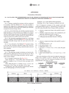 SIGNIFICANCE AND USE 4.1 Test Methods E119 and E1529, and other standard fire resistance test methods specify that throughout exposures to fire and the hose stream, a constant superimposed axial load be applied to a load-bearing test specimen to simulate a maximum load condition. These test methods specify that this superimposed load shall be as nearly as practicable the maximum allowable axial design load allowed by design under nationally recognized structural design criteria. For this practice, the nationally recognized structural design criteria is the National Design Specification (NDS) for Wood Construction 4.1.1 Alternatively, the standard fire resistance test methods shall be conducted by applying an axial load that is less than the maximum allowable axial design load as addressed by the NDS and this practice, but these tests shall be identified in the test report as being conducted under restricted load conditions. 4.1.2 The superimposed axial load, as well as the superimposed axial load as a percentage of the maximum allowable axial design load for the stud and as a percentage of the maximum allowable design load for the plate, shall be calculated using the Allowable Stress Design (ASD) method in the NDS and this practice shall be included in the test report. Note 1: The NDS should be used to ensure calculation of the superimposed load is in compliance with all applicable provisions of that document. Appendix X1 describes how to calculate the superimposed load in accordance with the NDS. 4.2 This practice describes procedures for calculating the superimposed axial load to be applied in standard fire resistance tests of wood-frame wall assemblies. 4.3 Statements in either the fire resistance test method standard or the nationally recognized structural design standard supersede any procedures described by this practice. SCOPE 1.1 This practice covers procedures for calculating the superimposed axial load required to be applied to load-bearing wood-frame walls throughout standard fire-resistance and fire and hose-stream tests. 1.2 The calculations determine the maximum load allowed by design for wood-frame wall assemblies under nationally recognized structural design criteria. 1.3 This practice is only applicable to those wood-frame assemblies for which the nationally recognized structural design criteria are contained in the National Design Specification for Wood Construction (NDS).2 1.4 The system of units to be used is that of the nationally recognized structural design criteria. For the NDS, the units are inch-pound. 1.5 The text of this standard references notes and footnotes which provide explanatory material. These notes and footnotes (excluding those in tables and figures) shall not be considered as requirements of the standard. 1.6 This standard does not purport to address all of the safety concerns, if any, associated with its use. It is the responsibility of the user of this standard to establish appropriate safety, health, and environmental practices and determine the applicability of regulatory limitations prior to use. 1.7 This international standard was developed in accordance with internationally recognized principles on standardization established in the Decision on Principles for the Development of International Standards, Guides and Recommendations issued by the World Trade Organization Technical Barriers to Trade (TBT) Committee.
