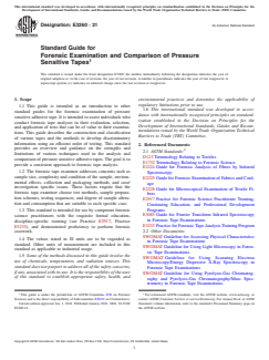 ASTM E3260-21 is a guide published by ASTM International. Its full title is "Standard Guide for Forensic Examination and Comparison of Pressure Sensitive Tapes". This standard covers: SIGNIFICANCE AND USE 6.1 This guide is designed to assist the forensic tape examiner in selecting and organizing an analytical scheme for the analysis, comparison, and identification of tapes. The size and condition of the sample(s) influences the choice of analytical scheme. The evaluation and interpretation of the data for each technique is an important part of an analytical scheme but it is outside the scope of this guide. These will be addressed in other ASTM standards. SCOPE 1.1 This guide is intended as an introduction to other standard guides for the forensic examination of pressure sensitive adhesive tape. It is intended to assist individuals who conduct forensic tape analyses in their evaluation, selection, and application of tests that can be of value to their examinations. This guide describes the construction and classification of various tapes and the methods to develop discriminatory information using an efficient order of testing. This standard provides an overview and guidance on the strengths and limitations of various techniques used in the analysis and comparison of pressure sensitive adhesive tapes. The goal is to provide a consistent approach to forensic tape analysis. 1.2 The forensic tape examiner addresses concerns such as sample size, complexity and condition of the sample, environmental effects, collection and packaging methods, and case/investigation specific issues. These factors require that the forensic tape examiner choose test methods, sample preparation schemes, testing sequences, and degree of sample alteration and consumption that are suitable to each specific case. 1.3 This standard is intended for use by competent forensic science practitioners with the requisite formal education, discipline-specific training (see Practice E2917, Practice E3233), and demonstrated proficiency to perform forensic casework. 1.4 The values stated in SI units are to be regarded as standard. Other units of measurement are included in this standard as applicable to industrial usage. 1.5 Some of the methods discussed in this guide involve the use of chemicals, temperatures, and radiation sources. This standard does not purport to address all of the safety concerns, if any, associated with its use. It is the responsibility of the user of this standard to establish appropriate safety, health, and environmental practices and determine the applicability of regulatory limitations prior to use. 1.6 This international standard was developed in accordance with internationally recognized principles on standardization established in the Decision on Principles for the Development of International Standards, Guides and Recommendations issued by the World Trade Organization Technical Barriers to Trade (TBT) Committee.