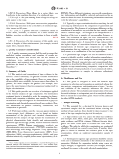 SIGNIFICANCE AND USE 6.1 This guide is designed to assist the forensic tape examiner in selecting and organizing an analytical scheme for the analysis, comparison, and identification of tapes. The size and condition of the sample(s) influences the choice of analytical scheme. The evaluation and interpretation of the data for each technique is an important part of an analytical scheme but it is outside the scope of this guide. These will be addressed in other ASTM standards. SCOPE 1.1 This guide is intended as an introduction to other standard guides for the forensic examination of pressure sensitive adhesive tape. It is intended to assist individuals who conduct forensic tape analyses in their evaluation, selection, and application of tests that can be of value to their examinations. This guide describes the construction and classification of various tapes and the methods to develop discriminatory information using an efficient order of testing. This standard provides an overview and guidance on the strengths and limitations of various techniques used in the analysis and comparison of pressure sensitive adhesive tapes. The goal is to provide a consistent approach to forensic tape analysis. 1.2 The forensic tape examiner addresses concerns such as sample size, complexity and condition of the sample, environmental effects, collection and packaging methods, and case/investigation specific issues. These factors require that the forensic tape examiner choose test methods, sample preparation schemes, testing sequences, and degree of sample alteration and consumption that are suitable to each specific case. 1.3 This standard is intended for use by competent forensic science practitioners with the requisite formal education, discipline-specific training (see Practice E2917, Practice E3233), and demonstrated proficiency to perform forensic casework. 1.4 The values stated in SI units are to be regarded as standard. Other units of measurement are included in this standard as applicable to industrial usage. 1.5 Some of the methods discussed in this guide involve the use of chemicals, temperatures, and radiation sources. This standard does not purport to address all of the safety concerns, if any, associated with its use. It is the responsibility of the user of this standard to establish appropriate safety, health, and environmental practices and determine the applicability of regulatory limitations prior to use. 1.6 This international standard was developed in accordance with internationally recognized principles on standardization established in the Decision on Principles for the Development of International Standards, Guides and Recommendations issued by the World Trade Organization Technical Barriers to Trade (TBT) Committee.
