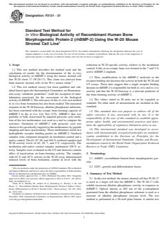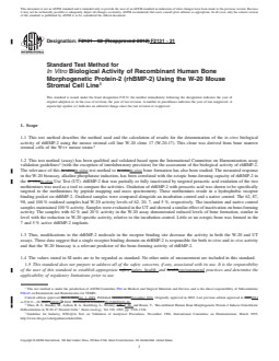 SIGNIFICANCE AND USE 4.1 Although the test method can be used for assessment of the bioactivity of crude preparations of rhBMP-2, it has only been validated for use with highly pure (>98 % by weight protein purity) preparations of rhBMP-2. SCOPE 1.1 This test method describes the method used and the calculation of results for the determination of the in-vitro biological activity of rhBMP-2 using the mouse stromal cell line W-20 clone 17 (W-20-17). This clone was derived from bone marrow stromal cells of the W++ mouse strain.2 1.2 This test method (assay) has been qualified and validated based upon the International Committee on Harmonization assay validation guidelines3 (with the exception of interlaboratory precision) for the assessment of the biological activity of rhBMP-2. The relevance of this in-vitro test method to in-vivo bone formation has also been studied. The measured response in the W-20 bioassay, alkaline phosphatase induction, has been correlated with the ectopic bone-forming capacity of rhBMP-2 in the in-vivo Use Test (UT). rhBMP-2 that was partially or fully inactivated by targeted peracetic acid oxidation of the two methionines was used as a tool to compare the activities. Oxidation of rhBMP-2 with peracetic acid was shown to be specifically targeted to the methionines by peptide mapping and mass spectrometry. These methionines reside in a hydrophobic receptor binding pocket on rhBMP-2. Oxidized samples were compared alongside an incubation control and a native control. The 62, 87, 98, and 100 % oxidized samples had W-20 activity levels of 62, 20, 7, and 5 %, respectively. The incubation and native control samples maintained 100 % activity. Samples were evaluated in the UT and showed a similar effect of inactivation on bone-forming activity. The samples with 62 % and 20 % activity in the W-20 assay demonstrated reduced levels of bone formation, similar in level with the reduction in W-20 specific activity, relative to the incubation control. Little or no ectopic bone was formed in the 7 and 5 % active rhBMP-2 implants. 1.3 Thus, modifications to the rhBMP-2 molecule in the receptor binding site decrease the activity in both the W-20 and UT assays. These data suggest that a single receptor binding domain on rhBMP-2 is responsible for both in-vitro and in-vivo activity and that the W-20 bioassay is a relevant predictor of the bone-forming activity of rhBMP-2. 1.4 The values stated in SI units are to be regarded as standard. No other units of measurement are included in this standard. 1.5 This standard does not purport to address all of the safety concerns, if any, associated with its use. It is the responsibility of the user of this standard to establish appropriate safety, health, and environmental practices and determine the applicability of regulatory limitations prior to use. 1.6 This international standard was developed in accordance with internationally recognized principles on standardization established in the Decision on Principles for the Development of International Standards, Guides and Recommendations issued by the World Trade Organization Technical Barriers to Trade (TBT) Committee.