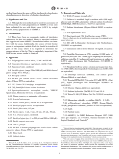 ASTM F2131-21 is a standard published by ASTM International. Its full title is "Standard Test Method for <emph type="ital"> In Vitro</emph> Biological Activity of Recombinant Human Bone Morphogenetic Protein-2 (rhBMP-2) Using the W-20 Mouse Stromal Cell Line". This standard covers: SIGNIFICANCE AND USE 4.1 Although the test method can be used for assessment of the bioactivity of crude preparations of rhBMP-2, it has only been validated for use with highly pure (>98 % by weight protein purity) preparations of rhBMP-2. SCOPE 1.1 This test method describes the method used and the calculation of results for the determination of the in-vitro biological activity of rhBMP-2 using the mouse stromal cell line W-20 clone 17 (W-20-17). This clone was derived from bone marrow stromal cells of the W++ mouse strain.2 1.2 This test method (assay) has been qualified and validated based upon the International Committee on Harmonization assay validation guidelines3 (with the exception of interlaboratory precision) for the assessment of the biological activity of rhBMP-2. The relevance of this in-vitro test method to in-vivo bone formation has also been studied. The measured response in the W-20 bioassay, alkaline phosphatase induction, has been correlated with the ectopic bone-forming capacity of rhBMP-2 in the in-vivo Use Test (UT). rhBMP-2 that was partially or fully inactivated by targeted peracetic acid oxidation of the two methionines was used as a tool to compare the activities. Oxidation of rhBMP-2 with peracetic acid was shown to be specifically targeted to the methionines by peptide mapping and mass spectrometry. These methionines reside in a hydrophobic receptor binding pocket on rhBMP-2. Oxidized samples were compared alongside an incubation control and a native control. The 62, 87, 98, and 100 % oxidized samples had W-20 activity levels of 62, 20, 7, and 5 %, respectively. The incubation and native control samples maintained 100 % activity. Samples were evaluated in the UT and showed a similar effect of inactivation on bone-forming activity. The samples with 62 % and 20 % activity in the W-20 assay demonstrated reduced levels of bone formation, similar in level with the reduction in W-20 specific activity, relative to the incubation control. Little or no ectopic bone was formed in the 7 and 5 % active rhBMP-2 implants. 1.3 Thus, modifications to the rhBMP-2 molecule in the receptor binding site decrease the activity in both the W-20 and UT assays. These data suggest that a single receptor binding domain on rhBMP-2 is responsible for both in-vitro and in-vivo activity and that the W-20 bioassay is a relevant predictor of the bone-forming activity of rhBMP-2. 1.4 The values stated in SI units are to be regarded as standard. No other units of measurement are included in this standard. 1.5 This standard does not purport to address all of the safety concerns, if any, associated with its use. It is the responsibility of the user of this standard to establish appropriate safety, health, and environmental practices and determine the applicability of regulatory limitations prior to use. 1.6 This international standard was developed in accordance with internationally recognized principles on standardization established in the Decision on Principles for the Development of International Standards, Guides and Recommendations issued by the World Trade Organization Technical Barriers to Trade (TBT) Committee.
