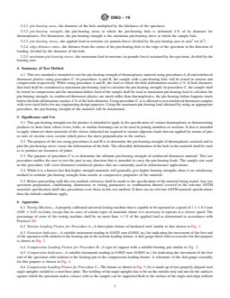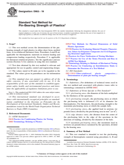 SIGNIFICANCE AND USE 5.1 This pin-bearing strength test for plastics is intended to apply in the specification of various thermoplastic or thermosetting products in sheet form where rivets, bolts, or similar fastenings are to be used in joining members or sections. It also is intended to apply wherever sheet materials of the classes indicated are required to sustain edgewise loads that are applied by means of pins or rods of circular cross section which pierce the sheet perpendicular to the surface. 5.2 The purpose of the test using procedures A and B is to determine the pin-bearing strength of thermoplastic material and to plot the pin-bearing stress versus the deformation of the hole. The allowable deformation of the hole in the material shall be such as to produce no looseness of joints. 5.3 The purpose of procedure C is to determine the ultimate pin-bearing strength of reinforced thermoset material. This test procedure enables the user to test the part in any direction that is intended to carry the pin-bearing loads. The sample size used in this procedure will cover thermoset reinforced plastics that are commonly used in infrastructure applications. 5.4 While it is a known fact that higher strength materials will generally give higher bearing strengths, there is no satisfactory method to estimate pin-bearing strength from tensile or compressive properties of the material. 5.5 Before proceeding with this test method, reference shall be made to the specification of the material being tested. Any test specimen preparation, conditioning, dimensions or testing parameters or combination thereof covered in the relevant ASTM materials specification shall take precedence over those in this test method. If there are no relevant ASTM material specifications then the default conditions apply. SCOPE 1.1 This test method covers the determination of the pin-bearing strength of rigid plastics in either sheet form, molded form, or in reinforced thermoset form. Procedures A and B are applicable for thermoplastic materials in tension loading and compression loading respectively. Procedure C is applicable for thermoset reinforced plastics. See the significance and use section (Section 5) for cautions in using this test standard. 1.2 Test data obtained by this test method is relevant and appropriate for use in quality control and engineering design. 1.3 The values stated in SI units are to be regarded as the standard. The values given in parentheses are for information only. 1.4 This standard does not purport to address all of the safety concerns, if any, associated with its use. It is the responsibility of the user of this standard to establish appropriate safety, health, and environmental practices and determine the applicability of regulatory limitations prior to use. Note 1: This standard and ISO 12815 address the same subject matter, but differ in technical content. 1.5 This international standard was developed in accordance with internationally recognized principles on standardization established in the Decision on Principles for the Development of International Standards, Guides and Recommendations issued by the World Trade Organization Technical Barriers to Trade (TBT) Committee.