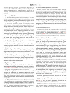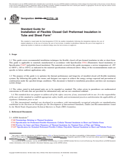SIGNIFICANCE AND USE 5.1 This guide applies to flexible closed cell insulation tubing and sheet materials manufactured according to Specifications C534 and C1427. This standard is intended to provide a basic guide for installing these types of materials. 5.2 Confirm application use temperature is consistent with specified use temperature for material as defined in ASTM Specifications unless otherwise agreed upon with the manufacturer. There are different grades for each of the insulation types referred to in this guide, material and grade installed should be that specified. 5.3 This guide is not intended to cover all aspects associated with installation for all applications, consult the National, Commercial Industrial Insulation Standards (MICA Manual) or the specific product manufacturer for recommendations, or both. See ASHRAE Handbook (Fundamentals – Chapter 23) and ASHRAE Handbook (Refrigeration – Chapter 10). SCOPE 1.1 This guide covers recommended installation techniques for flexible closed cell pre-formed insulation in tube or sheet form. This guide is applicable to materials manufactured in accordance with Specification C534 (Elastomeric based insulation) or Specification C1427 (polyolefin based insulation). The materials covered in this guide encompass a service temperature of –297 to 300°F (–183 to 150°C) as indicated in the material specifications referenced above. Many of the recommendations made are specific to below ambient applications only. 1.2 The purpose of this guide is to optimize the thermal performance and longevity of installed closed cell flexible insulation systems. By following this guide, the owner, and designer can expect to achieve the energy savings expected and prevention of condensation under the specified design conditions. This document is limited to installation procedures and does not encompass system design. 1.3 The values stated in inch-pound units are to be regarded as standard. The values given in parentheses are mathematical conversions to SI units that are provided for information only and are not considered standard. 1.4 This standard does not purport to address all of the safety concerns, if any, associated with its use. It is the responsibility of the user of this standard to establish appropriate safety, health, and environmental practices and determine the applicability of regulatory limitations prior to use. 1.5 This international standard was developed in accordance with internationally recognized principles on standardization established in the Decision on Principles for the Development of International Standards, Guides and Recommendations issued by the World Trade Organization Technical Barriers to Trade (TBT) Committee.