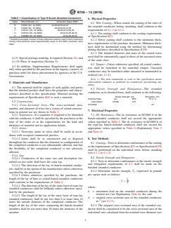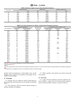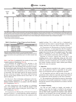 ABSTRACT This specification deals with bare fine-wire bunch-stranded and rope-lay bunch-stranded copper conductors made from round copper wires finer than No. 40 AWG, either coated or uncoated with tin or silver, for use as electrical conductors. The conductor types covered in this specification are designated Type B for bunch-stranded conductors, and Type R for rope-lay bunch-stranded conductors. On the other hand, the wire classifications are assigned as: Class R, stranded conductors using wire 42 AWG; Class S, stranded conductors using wire 44 AWG; Class T, stranded conductors using wire 46 AWG; Class U, stranded conductors using wire 48 AWG; and Class V, stranded conductors using wire 50 AWG. Wires shall undergo tests that shall evaluated their conformance to physical and electrical properties such as wire cross-sectional area and diameter, coating thickness, tensile strength, elongation, and DC resistance. SCOPE 1.1 This specification covers bare bunch-stranded and rope-lay bunch-stranded conductors made from round copper wires finer than No. 40 AWG with diameters less than 0.0031 in. (.078 mm), either coated or uncoated with tin or silver, for use as electrical conductors. (Explanatory Note 1). 1.2 The values stated in inch-pound units are to be regarded as standard. The values given in parentheses are mathematical conversions to SI units that are provided for information only and are not considered standard. 1.2.1 Exceptions—The SI values for density and temperature are to be regarded as standard. 1.3 This international standard was developed in accordance with internationally recognized principles on standardization established in the Decision on Principles for the Development of International Standards, Guides and Recommendations issued by the World Trade Organization Technical Barriers to Trade (TBT) Committee.