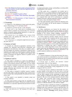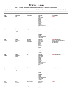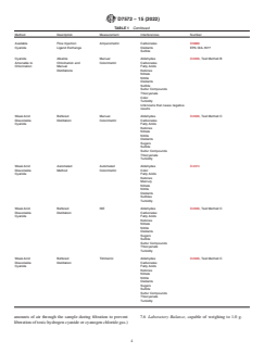 1.2 The sampling, preservation, and extraction procedures described in this guide are recommended for the analysis of total cyanide, available cyanide, weak acid dissociable cyanide, and free cyanide by Test Methods D2036, D4282, D4374, D6888, D6994, D7237, and D7284. The information supplied in this guide can also be applied to other analytical methods for cyanide, for example, US EPA Method 335.4.