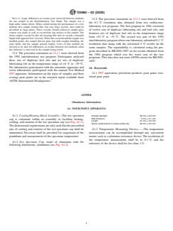 ASTM D5985-02(2020) is a standard published by ASTM International. Its full title is "Standard Test Method for Pour Point of Petroleum Products (Rotational Method)". This standard covers: SIGNIFICANCE AND USE 5.1 The pour point of a petroleum product is an index of the lowest temperature of its utility for certain applications. Flow characteristics, such as pour point, can be critical for the correct operation of lubricating systems, fuel systems, and pipeline operations. 5.2 Petroleum blending operations require precise measurement of the pour point. 5.3 This test method can determine the temperature of the test specimen with a resolution of 0.1 °C at which either crystals have formed or viscosity increases sufficiently to impede movement of the petroleum product. 5.4 This test method yields a pour point in a format similar to Test Method D97/IP15 when the 3 °C interval results are reported. Note 2: Since some users may wish to report their results in a format similar to Test Method D97 (in 3 °C intervals) the precisions were derived for the temperatures rounded to the 3 °C intervals. For statements on bias relative to Test Method D97, see 13.3. 5.5 This test method has better repeatability and comparable reproducibility relative to Test Method D97 as measured in the 1992 interlaboratory program. (See Section 13.) SCOPE 1.1 This test method covers the determination of pour point of petroleum products by an automatic instrument that continuously rotates the test specimen against a suspended detection device during cooling of the test specimen. 1.2 This test method is designed to cover the range of temperatures from −57 °C to +51 °C; however, the range of temperatures included in the 1992 interlaboratory program only covered the temperature range of −39 °C to +6 °C (see 13.4). 1.3 This test method determines the no-flow point of petroleum products by detection of the crystal structure or viscosity increase, or both, in the sample that is sufficient to impede flow of the specimen. 1.4 This test method is not intended for use with crude oils. Note 1: The applicability of this test method on residual fuel samples has not been verified. For further information on applicability, refer to 13.4. 1.5 The values stated in SI units are to be regarded as standard. No other units of measurement are included in this standard. 1.6 This standard does not purport to address all of the safety concerns, if any, associated with its use. It is the responsibility of the user of this standard to establish appropriate safety, health, and environmental practices and determine the applicability of regulatory limitations prior to use. 1.7 This international standard was developed in accordance with internationally recognized principles on standardization established in the Decision on Principles for the Development of International Standards, Guides and Recommendations issued by the World Trade Organization Technical Barriers to Trade (TBT) Committee.