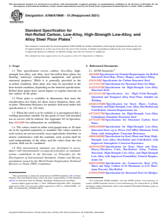 ASTM A786/A786M-15(2021) is a technical specification published by ASTM International. Its full title is "Standard Specification for Hot-Rolled Carbon, Low-Alloy, High-Strength Low-Alloy, and Alloy Steel Floor Plates". This standard covers: ABSTRACT This specification covers carbon, low-alloy, high-strength low-alloy, and alloy steel hot-rolled floor plates for flooring, stairways, transportation equipment, and general structural purposes. Steel materials shall undergo heat and product analysis. Steel specimens shall also undergo tensile tests and shall conform to the required values of yield point, yield strength, and tensile strength. SCOPE 1.1 This specification covers carbon, low-alloy, high-strength low-alloy, and alloy steel hot-rolled floor plates for flooring, stairways, transportation equipment, and general structural purposes. While it is generally provided in the as-rolled condition, floor plate also may be provided in the heat-treated condition, depending on the material specification. Rolled floor plates have raised figures at regular intervals on one surface of the plate. 1.2 Floor plate is available in dimensions that meet the classification size limits for sheet, heavy thickness sheet coil, or plate. Maximum thickness for product delivered under this specification is 1 in. [25 mm]. 1.3 When the steel is to be welded, it is presupposed that a welding procedure suitable for the grade of steel and intended use or service will be utilized. See Appendix X3 of Specification A6/A6M for information on weldability. 1.4 The values stated in either inch-pound units or SI units are to be regarded separately as standard. The values stated in each system are not necessarily exact equivalents; therefore, to ensure conformance with the standard, each system shall be used independently of the other, and the values from the two systems shall not be combined. 1.5 This international standard was developed in accordance with internationally recognized principles on standardization established in the Decision on Principles for the Development of International Standards, Guides and Recommendations issued by the World Trade Organization Technical Barriers to Trade (TBT) Committee.