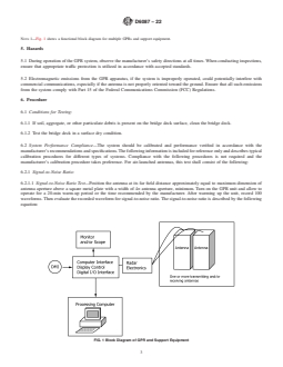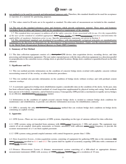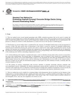 SIGNIFICANCE AND USE 3.1 This test method provides information on the condition of concrete bridge decks overlaid with asphaltic concrete without necessitating removal of the overlay, or other destructive procedures. 3.2 This test method also provides information on the condition of bridge decks without overlays and with portland cement concrete overlays. 3.3 A systematic approach to bridge deck rehabilitation requires considerable data on the condition of the decks. In the past, data has been collected using the traditional methods of visual inspection supplemented by physical testing and coring. Such methods have proven to be tedious, expensive, and of limited accuracy. Consequently, GPR provides a mechanism to rapidly survey bridges in an efficient, nondestructive manner. 3.4 Information on the condition of asphalt-covered concrete bridge decks is needed to estimate bridge deck condition for maintenance and rehabilitation, to provide cost-effective information necessary for rehabilitation contracts. 3.5 GPR is currently the only nondestructive method that can evaluate bridge deck condition on bridge decks containing an asphalt overlay. SCOPE 1.1 This test method covers several ground penetrating radar (GPR) evaluation procedures that can be used to evaluate the condition of concrete bridge decks overlaid with asphaltic concrete wearing surfaces. These procedures can also be used for bridge decks overlaid with portland cement concrete and for bridge decks without an overlay. Specifically, this test method predicts the presence or absence of concrete or rebar deterioration at or above the level of the top layer of reinforcing bar. 1.2 Deterioration in concrete bridge decks is manifested by the corrosion of embedded reinforcement or the decomposition of concrete, or both. The most serious form of deterioration is that which is caused by corrosion of embedded reinforcement. Corrosion may be initiated by deicing salts, used for snow and ice control in the winter months, penetrating the concrete. In arid climates, the corrosion can be initiated by chloride ions contained in the mix ingredients. Deterioration may also be initiated by the intrusion of water and aggravated by subsequent freeze/thaw cycles, causing damage to the concrete and subsequent debonding of the reinforcing steel with the surrounding compromised concrete. 1.2.1 As the reinforcing steel corrodes, it expands and creates a crack or subsurface fracture plane in the concrete at or just above the level of the reinforcement. The fracture plane, or delamination, may be localized or may extend over a substantial area, especially if the concrete cover to the reinforcement is small. It is not uncommon for more than one delamination to occur on different planes between the concrete surface and the reinforcing steel. Delaminations are not visible on the concrete surface. However, if repairs are not made, the delaminations progress to open spalls and, with continued corrosion, eventually affect the structural integrity of the deck. 1.2.2 The portion of concrete contaminated with excessive chlorides is generally structurally deficient compared with non-contaminated concrete. Additionally, the chloride-contaminated concrete provides a pathway for the chloride ions to initiate corrosion of the reinforcing steel. It is therefore of particular interest in bridge deck condition investigations to locate not only the areas of active reinforcement corrosion, but also areas of chloride-contaminated and otherwise deteriorated concrete. 1.3 This test method may not be suitable for evaluating bridges with delaminations that are localized over the diameter of the reinforcement, or for those bridges that have cathodic protection (coke breeze as cathode) installed on the bridge or for which a conductive aggregate has been used in the asphalt (that is, blast furnace slag). This is because metals are perfect reflectors of electromagnetic waves, since th...