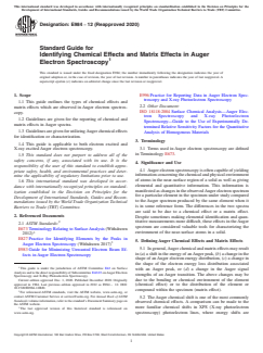 ASTM E984-12(2020), titled Standard Guide for Identifying Chemical Effects and Matrix Effects in Auger Electron Spectroscopy, is developed by ASTM International. This guide provides essential information on recognizing and reporting both chemical and matrix effects observed during Auger electron spectroscopy (AES) analyses. AES is a powerful surface analysis technique that yields valuable chemical and physical information about the near-surface regions of solid materials. Chemical and matrix effects, while sometimes complicating elemental identification and quantification, serve as helpful tools for better characterizing surface and interface environments in various scientific and industrial applications.