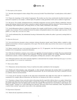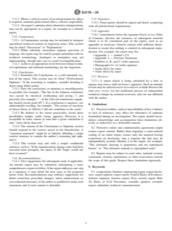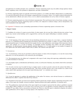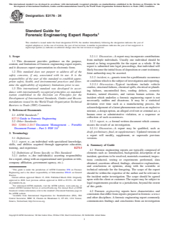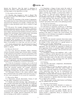 SIGNIFICANCE AND USE 5.1 This guide may be useful to forensic engineers, courts, jurists, attorneys, insurance adjusters, and clients of forensic engineers. Although this guide is directed to the practice of forensic engineering, its description of the elements of investigative reports may be useful to practitioners in other disciplines that embrace scientific laws and theories. 5.2 This guide is based on Guide E2713, which discusses elements of the practice of forensic engineering and provides suggested readings which may be of interest to those creating (or reading) forensic engineering reports. 5.3 This guide is informational and not mandatory. Not all items necessarily apply to all forensic engineering reports. Practitioners should adopt the requirements stated herein as appropriate to their individual situations. The author should verbally discuss findings with the client prior to the preparation of a written report. Not all clients will require a written report, and some may want a report with a focused scope or a report that follows a particular format. SCOPE 1.1 This document provides guidance on the purpose, content, and limitations of forensic engineering expert reports, and it discusses report representation in electronic form. 1.2 This standard does not purport to address all of the safety concerns, if any, associated with its use. It is the responsibility of the user of this standard to establish appropriate safety, health, and environmental practices and determine the applicability of regulatory limitations prior to use. 1.3 This international standard was developed in accordance with internationally recognized principles on standardization established in the Decision on Principles for the Development of International Standards, Guides and Recommendations issued by the World Trade Organization Technical Barriers to Trade (TBT) Committee.