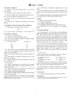 - Precision and Reporting: Details precision and reproducibility ranges, and specifies reporting requirements including sample identification, condition, organic matter percentage, and method used.