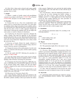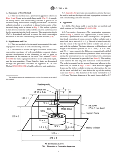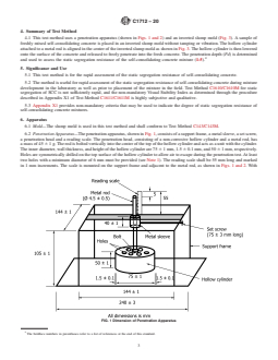 SIGNIFICANCE AND USE 5.1 This test method is for the rapid assessment of the static segregation resistance of self-consolidating concrete. 5.2 The method is useful for rapid assessment of the static segregation resistance of self-consolidating concrete during mixture development in the laboratory as well as prior to placement of the mixture in the field. Test Method C1610/C1610M for static segregation of SCC is not sufficiently rapid, and the non-mandatory Visual Stability Index as determined through the procedure described in Appendix X1 of Test Method C1611/C1611M is highly subjective and qualitative. 5.3 Appendix X1 provides non-mandatory criteria that may be used to indicate the degree of static segregation resistance of self-consolidating concrete mixtures. SCOPE 1.1 This test method covers the rapid assessment of static segregation resistance of normal-weight self-consolidating concrete (SCC). The test does not measure static segregation resistance directly, but provides an assessment of whether static segregation is likely to occur. 1.2 The test apparatus and protocol were developed based on tests with SCC mixtures containing saturated surface dry (SSD) coarse aggregates ranging in relative density from 2.67 to 2.79 and in nominal maximum size from 9.5 mm to 25 mm. For SCC mixtures outside these ranges, testing is recommended to establish a correlation between penetration depth and static segregation measured in accordance with Test Method C1610/C1610M. This test method shall not be used to assess the static segregation resistance of self-consolidating concrete containing lightweight aggregates or heavyweight aggregates without prior testing to establish a correlation. 1.3 The values stated in SI units are to be regarded as standard. No other units of measurement are included in this standard. 1.4 The text of this standard references notes and footnotes that provide explanatory material. These notes and footnotes shall not be considered as requirements of the standard. 1.5 This standard does not purport to address all of the safety concerns, if any, associated with its use. It is the responsibility of the user of this standard to establish appropriate safety, health, and environmental practices and determine the applicability of regulatory limitations prior to use. (Warning—Fresh hydraulic cementitious mixtures are caustic and may cause chemical burns to skin and tissue upon prolonged exposure.2) 1.6 This international standard was developed in accordance with internationally recognized principles on standardization established in the Decision on Principles for the Development of International Standards, Guides and Recommendations issued by the World Trade Organization Technical Barriers to Trade (TBT) Committee.
