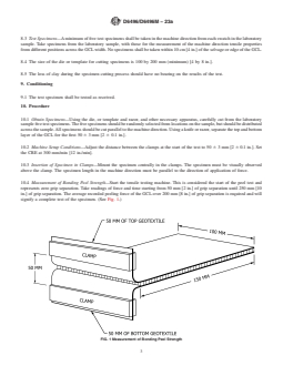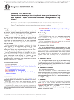 ASTM D6496/D6496M-23a is a standard published by ASTM International. Its full title is "Standard Test Method for Determining Average Bonding Peel Strength Between Top and Bottom Layers of Needle-Punched Geosynthetic Clay Liners". This standard covers: SIGNIFICANCE AND USE 5.1 The bonding strength test for the top and bottom layers of the geosynthetic clay liner is intended to be an index test. It is anticipated that the results of the test will be used to evaluate the quality of the bonding process. SCOPE 1.1 This test method covers the laboratory determination of the average bonding strength between the top and bottom layers of a sample of a geosynthetic clay liner (GCL). 1.2 The values stated in either SI units or inch-pound units are to be regarded separately as standard. The values stated in each system may not be exact equivalents; therefore, each system shall be used independently of the other. Combining values from the two systems may result in nonconformance with the standard. 1.3 This standard does not purport to address all of the safety concerns, if any, associated with its use. It is the responsibility of the user of this standard to establish appropriate safety, health, and environmental practices and determine the applicability of regulatory limitations prior to use. 1.4 This international standard was developed in accordance with internationally recognized principles on standardization established in the Decision on Principles for the Development of International Standards, Guides and Recommendations issued by the World Trade Organization Technical Barriers to Trade (TBT) Committee.