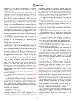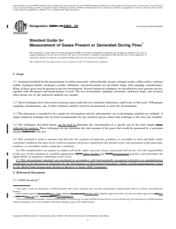 SIGNIFICANCE AND USE 4.1 Because of the loss of life in fires from inhalation of fire gases, much attention has been focused on the analyses of these species. Analysis has involved several new or modified methods, since common analytical techniques have often proven to be inappropriate for the combinations of various gases and low concentrations existing in fire gas mixtures. 4.2 In the measurement of fire gases, it is imperative to use procedures that are both reliable and appropriate to the unique atmosphere of a given fire environment. To maximize the reliability of test results, it is essential to establish the following: 4.2.1 That gaseous samples are representative of the compositions existing at the point of sampling, 4.2.2 That transfer and pretreatment of samples occur without loss, or with known efficiency, and 4.2.3 That data provided by the analytical instruments are accurate for the compositions and concentrations at the point of sampling. 4.3 This document includes a comprehensive survey that will permit an individual, technically skilled and practiced in the study of analytical chemistry, to select a suitable technique from among the alternatives. It will not provide enough information for the setup and use of a procedure (this information is available in the references). 4.4 Data generated by the use of techniques cited in this document should not be used to rank materials for regulatory purposes. SCOPE 1.1 Analytical methods for the measurement of carbon monoxide, carbon dioxide, oxygen, nitrogen oxides, sulfur oxides, carbonyl sulfide, hydrogen halides, hydrogen cyanide, aldehydes, and hydrocarbons are described, along with sampling considerations. Many of these gases may be present in any fire environment. Several analytical techniques are described for each gaseous species, together with advantages and disadvantages of each. The test environment, sampling constraints, analytical range, and accuracy often dictate use of one analytical method over another. 1.2 These techniques have been used to measure gases under fire test conditions (laboratory, small scale, or full scale). With proper sampling considerations, any of these methods could be used for measurement in most fire environments. 1.3 This document is intended to be a guide for investigators and for subcommittee use in developing standard test methods. A single analytical technique has not been recommended for any chemical species unless that technique is the only one available. 1.4 The techniques described herein can be used to determine the concentration of a specific gas in the total sample collected for analysis. These techniques do not determine the total amount of fire gases that would be generated by a specimen during a fire test. 1.5 This standard is used to measure and describe the response of materials, products, or assembles to heat and flame under controlled conditions but does not by itself incorporate all factors required for fire hazard or fire risk assessment of the materials, products, or assemblies under actual fire conditions. 1.6 This standard does not purport to address all of the safety concerns, if any, associated with its use. It is the responsibility of the user of this standard to establish appropriate safety, health, and environmental practices and determine the applicability of regulatory limitations prior to use. 1.7 This international standard was developed in accordance with internationally recognized principles on standardization established in the Decision on Principles for the Development of International Standards, Guides and Recommendations issued by the World Trade Organization Technical Barriers to Trade (TBT) Committee.