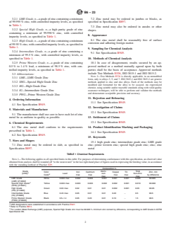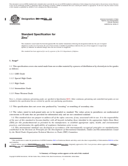 ABSTRACT This specification covers zinc metal made from ore or other material by a process of distillation or by electrolysis in five grades as follows: LME grade, special high grade, high grade, intermediate grade, and prime western grade. The zinc metal shall be tested and conform to the chemical composition requirements of lead, iron, cadmium, aluminum, copper, tin, and non-zinc metals prescribed in this specification. The material shall be free of surface corrosion and adhering foreign matter. Representative samples from the molten metal during casting, and all part of these samples may be cast into shapes suitable for use in spectrochemical methods. SCOPE 1.1 This specification covers zinc metal made from ore or other material by a process of distillation or by electrolysis in five grades as follows: 1.1.1 LME Grade 1.1.2 Special High Grade 1.1.3 High Grade 1.1.4 Intermediate Grade 1.1.5 Prime Western Grade Note 1: Certain continuous galvanizing grades are specified in Specification B852. Other continuous galvanizing and controlled lead grades are not included in this specification but are covered by specific user purchasing specifications. 1.2 This specification does not cover zinc produced by “sweating” or remelting of secondary zinc. 1.3 The values stated in inch-pound units are to be regarded as standard. The values given in parentheses are mathematical conversions to SI units that are provided for information only and are not considered standard. 1.4 This standard does not purport to address all of the safety concerns, if any, associated with its use. It is the responsibility of the user of this standard to become familiar with all hazards including those identified in the appropriate Safety Data Sheet (SDS) for this product/material as provided by the manufacturer, to establish appropriate safety, health, and environmental practices, and determine the applicability of regulatory limitations prior to use. 1.5 This international standard was developed in accordance with internationally recognized principles on standardization established in the Decision on Principles for the Development of International Standards, Guides and Recommendations issued by the World Trade Organization Technical Barriers to Trade (TBT) Committee.