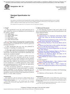 ASTM B6-23 is a technical specification published by ASTM International. Its full title is "Standard Specification for Zinc". This standard covers: ABSTRACT This specification covers zinc metal made from ore or other material by a process of distillation or by electrolysis in five grades as follows: LME grade, special high grade, high grade, intermediate grade, and prime western grade. The zinc metal shall be tested and conform to the chemical composition requirements of lead, iron, cadmium, aluminum, copper, tin, and non-zinc metals prescribed in this specification. The material shall be free of surface corrosion and adhering foreign matter. Representative samples from the molten metal during casting, and all part of these samples may be cast into shapes suitable for use in spectrochemical methods. SCOPE 1.1 This specification covers zinc metal made from ore or other material by a process of distillation or by electrolysis in five grades as follows: 1.1.1 LME Grade 1.1.2 Special High Grade 1.1.3 High Grade 1.1.4 Intermediate Grade 1.1.5 Prime Western Grade Note 1: Certain continuous galvanizing grades are specified in Specification B852. Other continuous galvanizing and controlled lead grades are not included in this specification but are covered by specific user purchasing specifications. 1.2 This specification does not cover zinc produced by “sweating” or remelting of secondary zinc. 1.3 The values stated in inch-pound units are to be regarded as standard. The values given in parentheses are mathematical conversions to SI units that are provided for information only and are not considered standard. 1.4 This standard does not purport to address all of the safety concerns, if any, associated with its use. It is the responsibility of the user of this standard to become familiar with all hazards including those identified in the appropriate Safety Data Sheet (SDS) for this product/material as provided by the manufacturer, to establish appropriate safety, health, and environmental practices, and determine the applicability of regulatory limitations prior to use. 1.5 This international standard was developed in accordance with internationally recognized principles on standardization established in the Decision on Principles for the Development of International Standards, Guides and Recommendations issued by the World Trade Organization Technical Barriers to Trade (TBT) Committee.