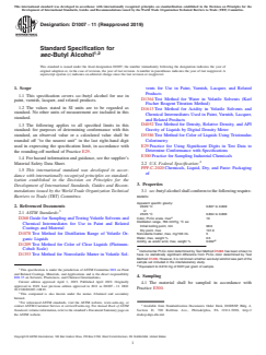 ASTM D1007-11(2019) - Standard Specification for sec-Butyl Alcohol sets out the requirements and test methods for sec-butyl alcohol (also known as 2-butanol or secondary butanol) used in the production of paint, varnish, lacquer, and related products. Published by ASTM International, this standard provides essential specifications to ensure the consistent quality, safety, and performance of sec-butyl alcohol as an industrial solvent. Adherence to this specification guaranteed that manufacturers and suppliers meet internationally recognized criteria, contributing to product reliability across diverse applications.