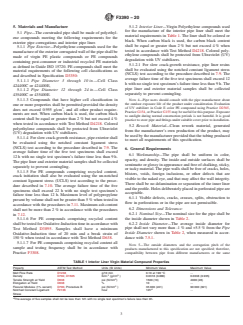 SCOPE 1.1 This specification covers requirements and test methods for flexible annular, corrugated profile wall polyethylene pipe with an interior liner. It covers nominal sizes 3 in. (75 mm), 4 in. (100 mm), 5 in. (125 mm), 6 in. (150 mm), 8 in. (200 mm), 10 in. (250 mm), 12 in. (300 mm), 15 in. (375 mm), 18 in (450 mm), and 24 in (600 mm). 1.2 The requirements of this specification are intended to provide non-pressure (gravity flow) lined flexible annular corrugated polyethylene pipe for subsurface and land drainage systems, such as agricultural or foundations, which do not operate under surcharge pressure heads. Note 1: Pipe produced in accordance with this specification is to be installed in compliance with Practice F449. Lined flexible annular corrugated polyethylene provides axial flexibility allowing for subsurface installation using tile plows and allows the pipe to be coiled for storage and transport. Note 2: Subsurface and land drainage systems pertain principally to agricultural applications for water table control. Note 3: Lined flexible pipe provided in coiled lengths will experience distortion or folding in the interior pipe liner which may adversely affect flow characteristics, contact the pipe manufacturer for hydraulic design guidance for the coiled lined flexible pipe. 1.3 This specification permits the use of recycled materials for pipe in accordance with the requirements in Section 5. 1.4 The values stated in inch-pound units are to be regarded as standard. The values given in parentheses are mathematical conversions to SI units that are provided for information only and are not considered standard. 1.5 This standard does not purport to address all of the safety concerns, if any, associated with its use. It is the responsibility of the user of this standard to establish appropriate safety, health, and environmental practices and determine the applicability of regulatory limitations prior to use. 1.6 This international standard was developed in accordance with internationally recognized principles on standardization established in the Decision on Principles for the Development of International Standards, Guides and Recommendations issued by the World Trade Organization Technical Barriers to Trade (TBT) Committee.