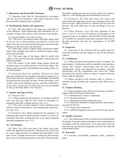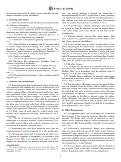 ABSTRACT This specification provides the minimum requirements for construction, materials, performance, and dimensions of arch-type non-metallic expansion joints. Expansion joints shall be fabricated with an elastomeric tube reinforced with multiple plies of woven cloth or tire cord covered with synthetic rubber. The inner tube shall be a natural rubber, synthetic rubber, or blend of synthetic rubber. The woven cloth or tire cord shall be nylon, polyester, fiberglass, or aramid, and shall not be cotton. The reinforcing fabric shall be impregnated with a compatible friction stock. Additional reinforcement to the fabric may be provided in the body of the expansion joint and may be solid metal rings or wire embedded in the synthetic rubber. Body rings, if used, must be welded before being installed in the expansion joint body. All expansion joints shall be manufactured with a cover of Hypalon or Neoprene (Chloroprene). The requirements for (1) integral rubber and fabric flanges, (2) floating metal flanges, (3) arches, (4) metallic flanges, (5) retaining rings, and (6) expansion joint cover and body. All expansion joints shall be designed for the specified pressure requirement. Performance requirements for single arch expansion movement and multiple arch-joint movement, as well as the pressure rating, are specified. The following tests shall be performed if required: burst test for prototype testing, hydrostatic test for production testing, and flame resistance test. SCOPE 1.1 This specification provides the minimum requirements for construction, materials, performance, and dimensional requirements of arch-type non-metallic expansion joints. 1.2 The values stated in inch-pound units are to be regarded as standard. The values given in parentheses are mathematical conversions to SI units that are provided for information only and are not considered standard. 1.3 The following safety hazards caveat pertains only to the test method described in this specification. This standard does not purport to address all of the safety concerns, if any, associated with its use. It is the responsibility of the user of this standard to establish appropriate safety, health, and environmental practices and determine the applicability of regulatory limitations prior to use. 1.4 This international standard was developed in accordance with internationally recognized principles on standardization established in the Decision on Principles for the Development of International Standards, Guides and Recommendations issued by the World Trade Organization Technical Barriers to Trade (TBT) Committee.