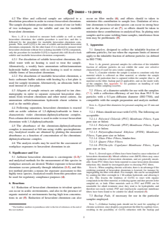 ASTM D6832-13(2018) is a standard published by ASTM International. Its full title is "Standard Test Method for the Determination of Hexavalent Chromium in Workplace Air by Ion Chromatography and Spectrophotometric Measurement Using 1,5-diphenylcarbazide". This standard covers: SIGNIFICANCE AND USE 5.1 Airborne hexavalent chromium is carcinogenic (1-3),4 and analytical methods for the measurement of this species in workplace aerosols are desired. Worker exposure to hexavalent chromium occurs primarily through inhalation (1-3), and this test method provides a means for exposure assessment to this highly toxic species. Analytical results from this procedure can be used for regulatory compliance purposes (4). SCOPE 1.1 This test method specifies a method for the determination of the time-weighted average mass concentration of hexavalent chromium in workplace air samples. 1.2 This test method is applicable to the personal sampling of the inhalable fraction of airborne particles, as defined in ISO 7708, and to area (static) sampling. 1.3 The sample dissolution procedure specifies separate procedures for soluble and insoluble hexavalent chromium. 1.4 This test method is applicable to the determination of masses of 0.01 μg to 10 μg of hexavalent chromium per sample without dilution. 1.5 The concentration range for hexavalent chromium in air for which this procedure is applicable is approximately 0.1 μg/m3 to 100 μg/m3, assuming 1 m3 of air sample. The range can be extended upwards by appropriate dilution. 1.6 Interconversion of trivalent and hexavalent chromium species may occur during sampling and sample preparation, but these processes are minimized to the extent possible by the sampling and sample preparation procedures employed. 1.7 The values stated in SI units are to be regarded as standard. No other units of measurement are included in this standard. 1.8 This standard does not purport to address all of the safety concerns, if any, associated with its use. It is the responsibility of the user of this standard to establish appropriate safety, health, and environmental practices and determine the applicability of regulatory limitations prior to use. 1.9 This international standard was developed in accordance with internationally recognized principles on standardization established in the Decision on Principles for the Development of International Standards, Guides and Recommendations issued by the World Trade Organization Technical Barriers to Trade (TBT) Committee.