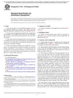 ASTM E133-92(2022) is a technical specification published by ASTM International. Its full title is "Standard Specification for Distillation Equipment". This standard covers: ABSTRACT This specification covers distillation equipment. The equipment shall consist of the following: distillation flasks, condenser, cooling bath, metal shield or enclosure for flask (type 1 or type 2), heat source (gas burner or electric heater), flask support (type 1 or type 2), graduated cylinders, and thermometers. SCOPE 1.1 This specification covers distillation equipment used in the following ASTM test methods: D86, D850, and (for approved alternative requirements only) Test Method D1078. 1.2 Some items of equipment included in this specification are common to all methods; other items are not. Therefore, those portions of this specification pertinent to the need must be selected. 1.3 The values stated in inch-pound units are to be regarded as standard. The values given in parentheses are mathematical conversions to SI units that are provided for information only and are not considered standard. 1.4 This international standard was developed in accordance with internationally recognized principles on standardization established in the Decision on Principles for the Development of International Standards, Guides and Recommendations issued by the World Trade Organization Technical Barriers to Trade (TBT) Committee.
