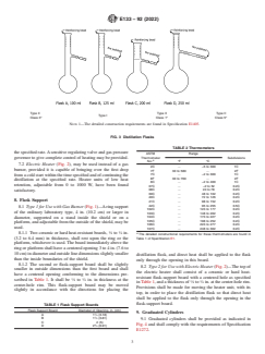 ABSTRACT This specification covers distillation equipment. The equipment shall consist of the following: distillation flasks, condenser, cooling bath, metal shield or enclosure for flask (type 1 or type 2), heat source (gas burner or electric heater), flask support (type 1 or type 2), graduated cylinders, and thermometers. SCOPE 1.1 This specification covers distillation equipment used in the following ASTM test methods: D86, D850, and (for approved alternative requirements only) Test Method D1078. 1.2 Some items of equipment included in this specification are common to all methods; other items are not. Therefore, those portions of this specification pertinent to the need must be selected. 1.3 The values stated in inch-pound units are to be regarded as standard. The values given in parentheses are mathematical conversions to SI units that are provided for information only and are not considered standard. 1.4 This international standard was developed in accordance with internationally recognized principles on standardization established in the Decision on Principles for the Development of International Standards, Guides and Recommendations issued by the World Trade Organization Technical Barriers to Trade (TBT) Committee.