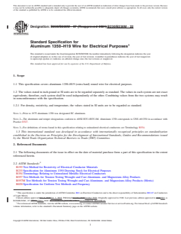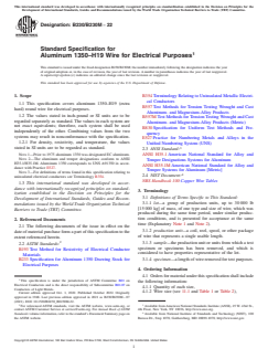 ASTM B230/B230M-22 is a technical specification published by ASTM International. Its full title is "Standard Specification for Aluminum 1350–H19 Wire for Electrical Purposes". This standard covers: ABSTRACT This specification covers the standard requirements for aluminum 1350-H19, extra hard, round wire for electrical purposes. The aluminum wire shall be made from drawing stock and shall be free of brittleness as evidenced by its ability to be coiled or looped around its own diameter with or without a mandrel. Joints may also be made during the final drawing or in the finished wire by electric-butt welding, cold-pressure welding, or electric-butt, cold-upset welding. Tension tests shall be performed; wherein, the wire shall conform to the tensile strength, elongation, and bending specifications. The specimen shall also conform to the electrical resistivity requirements. SCOPE 1.1 This specification covers aluminum 1350–H19 (extra hard) round wire for electrical purposes. 1.2 The values stated in inch-pound or SI units are to be regarded separately as standard. The values in each system are not exact equivalents; therefore, each system shall be used independently of the other. Combining values from the two systems may result in nonconformance with the specification. 1.2.1 For density, resistivity, and temperature, the values stated in SI units are to be regarded as standard. Note 1: Prior to 1975 aluminum 1350 was designated EC aluminum. Note 2: The aluminum and temper designations conform to ANSI H35.1/H35.1M. Aluminum 1350 corresponds to UNS A91350 in accordance with Practice E527. Note 3: For definitions of terms found in this specification relating to uninsulated electrical conductors see Terminology B354. 1.3 This international standard was developed in accordance with internationally recognized principles on standardization established in the Decision on Principles for the Development of International Standards, Guides and Recommendations issued by the World Trade Organization Technical Barriers to Trade (TBT) Committee.