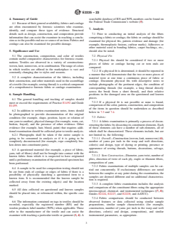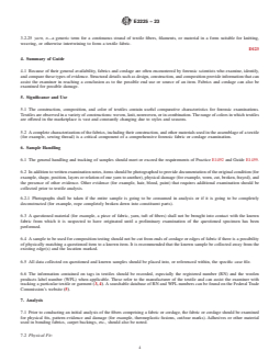 SIGNIFICANCE AND USE 5.1 The construction, composition, and color of textiles contain useful comparative characteristics for forensic examinations. Textiles are observed in a variety of constructions: woven, knit, nonwoven, or in combination. The range of colors in which textiles are offered in the marketplace is vast and constantly changing due to styles and seasons. 5.2 A complete characterization of the fabrics, including their construction, and other materials used in the assemblage of a textile (for example, sewing thread) is a critical component of a comprehensive forensic fabric or cordage examination. SCOPE 1.1 This guide is intended to assist individuals and laboratories that conduct examinations of fabrics and cordage for the purposes of analyzing and comparing types of fabric, cordage and damage. A complete characterization of the fabrics, including their construction and other materials used in the assemblage of a textile (for example, sewing thread), is a critical component of a comprehensive forensic fabric or cordage examination. 1.2 The values stated in inch-pound units are to be regarded as standard. No other units of measurement are included in this standard. 1.3 This standard is intended for use by competent forensic science practitioners with the requisite formal education, discipline-specific training (see Practice E2917), and demonstrated proficiency to perform forensic case work 1.4 This standard does not purport to address all of the safety concerns, if any, associated with its use. It is the responsibility of the user of this standard to establish appropriate safety, health, and environmental practices and determine the applicability of regulatory limitations prior to use. 1.5 This international standard was developed in accordance with internationally recognized principles on standardization established in the Decision on Principles for the Development of International Standards, Guides and Recommendations issued by the World Trade Organization Technical Barriers to Trade (TBT) Committee.