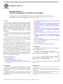 ASTM E2225-23 is a guide published by ASTM International. Its full title is "Standard Guide for Forensic Examination of Fabrics and Cordage". This standard covers: SIGNIFICANCE AND USE 5.1 The construction, composition, and color of textiles contain useful comparative characteristics for forensic examinations. Textiles are observed in a variety of constructions: woven, knit, nonwoven, or in combination. The range of colors in which textiles are offered in the marketplace is vast and constantly changing due to styles and seasons. 5.2 A complete characterization of the fabrics, including their construction, and other materials used in the assemblage of a textile (for example, sewing thread) is a critical component of a comprehensive forensic fabric or cordage examination. SCOPE 1.1 This guide is intended to assist individuals and laboratories that conduct examinations of fabrics and cordage for the purposes of analyzing and comparing types of fabric, cordage and damage. A complete characterization of the fabrics, including their construction and other materials used in the assemblage of a textile (for example, sewing thread), is a critical component of a comprehensive forensic fabric or cordage examination. 1.2 The values stated in inch-pound units are to be regarded as standard. No other units of measurement are included in this standard. 1.3 This standard is intended for use by competent forensic science practitioners with the requisite formal education, discipline-specific training (see Practice E2917), and demonstrated proficiency to perform forensic case work 1.4 This standard does not purport to address all of the safety concerns, if any, associated with its use. It is the responsibility of the user of this standard to establish appropriate safety, health, and environmental practices and determine the applicability of regulatory limitations prior to use. 1.5 This international standard was developed in accordance with internationally recognized principles on standardization established in the Decision on Principles for the Development of International Standards, Guides and Recommendations issued by the World Trade Organization Technical Barriers to Trade (TBT) Committee.