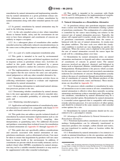 SIGNIFICANCE AND USE 4.1 The approach presented in this guide is a practical and streamlined process for determining the appropriateness of remediation by natural attenuation and implementing remediation by natural attenuation at a given petroleum release site. This information can be used to evaluate remediation by natural attenuation along with other remedial options for each site. 4.2 In general, remediation by natural attenuation may be used in the following instances: 4.2.1 As the sole remedial action at sites where immediate threats to human health, safety and the environment do not exist or have been mitigated, and constituents of concern are unlikely to impact a receptor; 4.2.2 As a subsequent phase of remediation after another remedial action has sufficiently reduced concentrations/mass in the source area so that plume impacts on receptors are unlikely; or 4.2.3 As a part of a multi-component remediation plan. 4.3 This guide is intended to be used by environmental consultants, industry, and state and federal regulators involved in response actions at petroleum release sites. Activities described in this guide should be performed by a person appropriately trained to conduct the corrective action process. 4.4 The implementation of remediation by natural attenuation requires that the user exercise the same care and professional judgement as with any other remedial alternative by: 4.4.1 Ensuring that site characterization activities focus on collecting information required to evaluate and implement remediation by natural attenuation; 4.4.2 Evaluating information to understand natural attenuation processes present at the site; 4.4.3 Determining whether remediation by natural attenuation is the most appropriate and cost-effective remedial alternative with a reasonable probability of achieving remedial goals; and 4.4.4 Monitoring remedial progress. 4.5 Application and implementation of remediation by natural attenuation is intended to be compatible wit... SCOPE 1.1 This is a guide for determining the appropriateness of remediation by natural attenuation and implementing remediation by natural attenuation at a given petroleum release site, either as a stand alone remedial action or in combination with other remedial actions. 1.2 Natural attenuation is a potential remediation alternative for containment and reduction of the mass and concentration of petroleum hydrocarbons in the environment to protect human health and the environment. Remediation by natural attenuation depends upon natural processes such as biodegradation, dispersion, dilution, volatilization, hydrolysis, and sorption to attenuate petroleum constituents of concern to achieve remedial goals. Note 1: Remedial goals must be established through another process as determined by the appropriate regulatory agency. 1.3 In general, remediation by natural attenuation should not be considered a presumptive remedy. A determination of whether remediation by natural attenuation is appropriate for an individual petroleum release site, relative to site-specific remedial goals, requires site characterization, assessment of potential risks, evaluation of the need for source area control, and evaluation of potential effectiveness similar to other remedial action technologies. Application and implementation of remediation by natural attenuation requires demonstration of remedial progress and attainment of remedial goals by use of converging lines of evidence obtained through monitoring and evaluation of resulting data. When properly applied to a site, remediation by natural attenuation is a process for risk management and achieving remedial goals. Monitoring should be conducted until it has been demonstrated that natural attenuation will continue and eventually meet remedial goals. 1.3.1 The primary line of evidence for remediation by natural attenuation is provided by observed reductions in plume geometry and observed re...