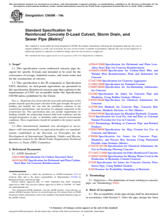 ASTM C655M-19a is the internationally recognized specification for reinforced concrete D-load culvert, storm drain, and sewer pipe using SI (metric) units. This standard developed by ASTM covers the production and acceptance criteria for reinforced concrete pipe used for the conveyance of sewage, industrial waste, and storm water, as well as for the construction of culverts in infrastructure projects. The specification outlines material requirements, design standards, manufacturing criteria, physical properties, and methods for testing and acceptance, ensuring product quality and performance in a variety of civil engineering applications.