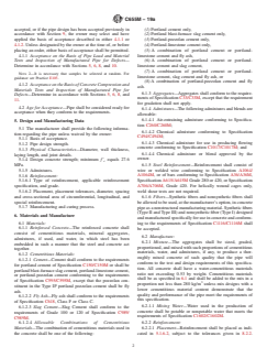 ABSTRACT This specification covers reinforced concrete pipe, D-load culvert, storm drain, and sewer pipe for the conveyance of sewage, industrial wastes, and storm water. The numerical values in this specification are not presented in inch-pound units, but rather, in metric or SI units only. The reinforced concrete shall consist of cementitious materials, mineral aggregates, and water, in which steel has been embedded in such a manner that the steel and concrete act together. The combination of cementitious materials used in the concrete shall be only one of the following: Portland cement, Portland blast furnace slag cement, slag modified Portland cement, Portland pozzolan cement, a combination of Portland cement and fly ash, a combination of Portland cement and ground granulated blast-furnace slag, or a combination of Portland cement, ground granulated blast furnace slag, and fly ash. Reinforcement shall conform to the standard specification. Physical requirements shall conform to the design strength designation of the pipe during load test. The aggregates shall be sized, graded, proportioned, and mixed with such proportions of cementitious materials and water as will produce a homogeneous concrete mixture of such quality that the pipe shall conform to the test and design requirements of this specification. The strength of the pipe shall not be adversely affected by the splice. Compression tests for determining concrete compressive strength shall be allowed to be made on either concrete cylinders or on cores drilled from the pipe. Pipe shall be repaired, if necessary, because of imperfections in manufacture, damage during handling, or pipe that have been cored for testing. SCOPE 1.1 This specification covers reinforced concrete pipe designed for specific D-loads and intended to be used for the conveyance of sewage, industrial wastes, and storm water and for the construction of culverts. 1.2 This specification is the SI companion to Specification C655; therefore, no inch-pound equivalents are presented in this specification. Reinforced concrete pipe that conform to the requirements of C655 are acceptable under this Specification C655M unless prohibited by the Owner. Note 1: Experience has shown that the successful performance of this product depends upon the proper selection of the pipe strength, the type of bedding and backfill, the care that the installation conforms to the construction specifications, and provision for adequate inspection at the construction site. This specification does not include requirements for bedding, backfill, the relationship between field load conditions and the strength designation of pipe, or durability under unusual environmental conditions. These requirements should be included in the project specification. 1.3 This international standard was developed in accordance with internationally recognized principles on standardization established in the Decision on Principles for the Development of International Standards, Guides and Recommendations issued by the World Trade Organization Technical Barriers to Trade (TBT) Committee.
