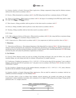ABSTRACT This specification covers crosslinked polyethylene (PEX) push-fit mechanical fittings for use with crosslinked polyethylene (PEX) tubing that meet the requirements of Specification F876. These fittings are intended for use in residential and commercial, hot and cold, potable water distribution systems as well as hydronic heating, including under-floor heating systems. Included are the requirements for materials, workmanship, dimensions, performance, and markings to be used on the fittings. SCOPE 1.1 This specification covers crosslinked polyethylene (PEX) push-fit mechanical fittings for use with crosslinked polyethylene (PEX) tubing in 1/2 , 3/4 , 1 and 1 1/4 in. nominal diameters that meet the requirements of Specification F876. These fittings are intended for use in residential and commercial, hot and cold, potable water distribution systems as well as hydronic heating, including under-floor heating systems, up to and including 100 psig (6.90 bar) and 180 °F (82 °C). Included are the requirements for materials, workmanship, dimensions, performance, and markings to be used on the fittings. 1.2 The values stated in inch-pound units are to be regarded as standard. The values given in parentheses are mathematical conversions to SI units that are provided for information only and are not considered standard. 1.3 The text of this specification references notes, footnotes, and appendixes which provide explanatory material. These notes and footnotes (excluding those in tables and figures) shall not be considered as requirements of the specification. 1.4 This standard does not purport to address all of the safety concerns, if any, associated with its use. It is the responsibility of the user of this standard to establish appropriate safety, health, and environmental practices and determine the applicability of regulatory limitations prior to use. 1.5 This international standard was developed in accordance with internationally recognized principles on standardization established in the Decision on Principles for the Development of International Standards, Guides and Recommendations issued by the World Trade Organization Technical Barriers to Trade (TBT) Committee.