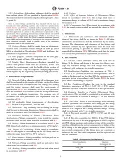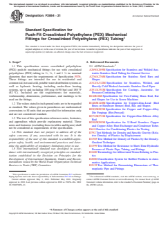ASTM F2854-21 is a technical specification published by ASTM International. Its full title is "Standard Specification for Push-Fit Crosslinked Polyethylene (PEX) Mechanical Fittings for Crosslinked Polyethylene (PEX) Tubing". This standard covers: ABSTRACT This specification covers crosslinked polyethylene (PEX) push-fit mechanical fittings for use with crosslinked polyethylene (PEX) tubing that meet the requirements of Specification F876. These fittings are intended for use in residential and commercial, hot and cold, potable water distribution systems as well as hydronic heating, including under-floor heating systems. Included are the requirements for materials, workmanship, dimensions, performance, and markings to be used on the fittings. SCOPE 1.1 This specification covers crosslinked polyethylene (PEX) push-fit mechanical fittings for use with crosslinked polyethylene (PEX) tubing in 1/2 , 3/4 , 1 and 1 1/4 in. nominal diameters that meet the requirements of Specification F876. These fittings are intended for use in residential and commercial, hot and cold, potable water distribution systems as well as hydronic heating, including under-floor heating systems, up to and including 100 psig (6.90 bar) and 180 °F (82 °C). Included are the requirements for materials, workmanship, dimensions, performance, and markings to be used on the fittings. 1.2 The values stated in inch-pound units are to be regarded as standard. The values given in parentheses are mathematical conversions to SI units that are provided for information only and are not considered standard. 1.3 The text of this specification references notes, footnotes, and appendixes which provide explanatory material. These notes and footnotes (excluding those in tables and figures) shall not be considered as requirements of the specification. 1.4 This standard does not purport to address all of the safety concerns, if any, associated with its use. It is the responsibility of the user of this standard to establish appropriate safety, health, and environmental practices and determine the applicability of regulatory limitations prior to use. 1.5 This international standard was developed in accordance with internationally recognized principles on standardization established in the Decision on Principles for the Development of International Standards, Guides and Recommendations issued by the World Trade Organization Technical Barriers to Trade (TBT) Committee.