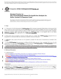 SIGNIFICANCE AND USE 5.1 On-line, at-line, in-line, CFMS, and other near-real time monitoring systems that measure fuel gas characteristics, such as the sulfur content, are prevalent in the natural gas and fuel gas industries. The installation and operation of particular systems vary on the specific objectives, contractual obligations, process type, regulatory requirements, and internal performance requirements needed by the user. This standard is intended to provide guidelines for standardized start-up procedures, operating procedures, and quality assurance practices for on-line, at-line, in-line, CFMS, and other near-real time gas chromatographic based sulfur monitoring systems used to determine fuel gas sulfur content. For measurement of gaseous fuel properties using laboratory based methods, the user is referred to Test Methods D1072, D1945, D4084, D4468, D4810, D7833, and Practices D4626, E594. SCOPE 1.1 This practice is for the determination of gas phase sulfur-containing compounds in high methane content gaseous fuels such as natural gas using on-line/at-line instrumentation, and continuous fuel monitors (CFMS). It has been successfully applied to other types of gaseous samples including air, digester, landfill, and refinery fuel gas. The detection range for sulfur compounds, reported as picograms sulfur, based upon the analysis of a 1 mL sample, is one hundred (100) to one million (1 000 000). This is equivalent to 0.1 to 1000 mg/m3. 1.2 This practice does not purport to measure all sulfur species in a sample. Only gas phase compounds that are transported to an instrument under the measurement conditions selected are measured. 1.3 Units—The values stated in SI units are to be regarded as standard. No other units of measurement are included in this standard. 1.4 This standard does not purport to address all of the safety concerns, if any, associated with its use. It is the responsibility of the user of this standard to establish appropriate safety, health, and environmental practices and determine the applicability of regulatory limitations prior to use. 1.5 This international standard was developed in accordance with internationally recognized principles on standardization established in the Decision on Principles for the Development of International Standards, Guides and Recommendations issued by the World Trade Organization Technical Barriers to Trade (TBT) Committee.