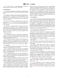 ABSTRACT This specification covers the requirements and test methods for direct-reading liquid crystal forehead thermometers, in either the continuous or intermittent reading modes, designed to monitor trends or measure human forehead surface temperatures, or both. When examined by test methods recommended herein, each thermometer shall comply with thermal profile, temperature range, tolerance, sequencing, operating and storage environment, and labeling requirements. SCOPE 1.1 This specification covers direct-reading liquid crystal forehead thermometers designed to monitor trends or measure human forehead surface temperatures, or both. 1.2 Thermometers covered by this specification are generally available in continuous or intermittent reading modes. Thermometers meeting the requirements specified herein shall be considered as complying with this specification. 1.3 The following precautionary caveat pertains only to the test method portion, Section 5, of this specification. This standard does not purport to address all of the safety concerns, if any, associated with its use. It is the responsibility of the user of this standard to establish appropriate safety, health, and environmental practices and determine the applicability of regulatory limitations prior to use. 1.4 This international standard was developed in accordance with internationally recognized principles on standardization established in the Decision on Principles for the Development of International Standards, Guides and Recommendations issued by the World Trade Organization Technical Barriers to Trade (TBT) Committee.