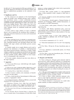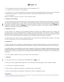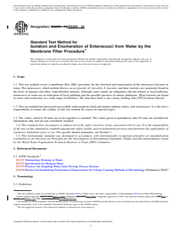 SIGNIFICANCE AND USE 5.1 The enterococci are indicators of the bacteriological quality for potable water, shellfish growing waters, ambient, and recreational waters. A direct relationship between swimming, associated gastroenteritis, and enterococci has been established through epidemiological studies and marine and fresh water bathing beaches. These studies have led to the development of criteria that can be used to establish bathing water standards based on established health-water quality relationships. 5.2 Since small or large volumes of water or dilutions thereof, can be analyzed by the membrane filter technique, a wide range of levels of enterococci in water can be enumerated and detected. SCOPE 1.1 This test method covers a membrane filter (MF) procedure for the detection and enumeration of the enterococci bacteria in water. The enterococci, which include Entero-coccus faecalis (E. faecalis), E. faecium, and their varieties are commonly found in the feces of humans and other warm-blooded animals. Although some strains are ubiquitous and not related to fecal pollution, enterococci in water are an indication of fecal pollution and the possible presence of enteric pathogens. These bacteria are found in water and wastewater in a wide range of densities. The detection limit is one colony forming unit (CFU)/volume filtered. 1.2 This test method has been used successfully with temperate fresh and marine ambient waters, and wastewaters. It is the user’s responsibility to ensure the validity of this test method for waters of untested types. 1.3 The values stated in SI units are to be regarded as standard. The values given in parentheses after SI units are included for information only and are not considered standard. 1.4 This standard does not purport to address all of the safety concerns, if any, associated with its use. It is the responsibility of the user of this standard to establish appropriate safety, health, and environmental practices and determine the applicability of regulatory limitations prior to use. For specific hazard statements, see Section 9. 1.5 This international standard was developed in accordance with internationally recognized principles on standardization established in the Decision on Principles for the Development of International Standards, Guides and Recommendations issued by the World Trade Organization Technical Barriers to Trade (TBT) Committee.