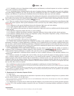 SIGNIFICANCE AND USE 4.1 Significance: 4.1.1 When conducting exposures in devices that use laboratory light sources, it is important to consider how well the accelerated test conditions will reproduce property changes and failure modes associated with end-use environments for the materials being tested. In addition, it is essential to consider the effects of variability in both the accelerated test and outdoor exposures when setting up exposure experiments and when interpreting the results from accelerated exposure tests. 4.1.2 No laboratory exposure test can be specified as a total simulation of actual use conditions in outdoor environments. Results obtained from these laboratory accelerated exposures can be considered as representative of actual use exposures only when the degree of rank correlation has been established for the specific materials being tested and when the type of degradation is the same. The relative durability of materials in actual use conditions can be very different in different locations because of differences in UV radiation, time of wetness, relative humidity, temperature, pollutants, and other factors. Therefore, even if results from a specific exposure test conducted according to this practice are found to be useful for comparing the relative durability of materials exposed in a particular exterior environment, it cannot be assumed that they will be useful for determining relative durability of the same materials for a different environment. 4.1.3 Even though it is very tempting, calculation of an acceleration factor relating x h or megajoules of radiant exposure in a laboratory accelerated test to y months or years of exterior exposure is not recommended. These acceleration factors are not valid for several reasons. 4.1.3.1 Acceleration factors are material dependent and can be significantly different for each material and for different formulations of the same material. 4.1.3.2 Variability in the rate of degradation in both actual use and la... SCOPE 1.1 This practice covers general procedures to be used when exposing nonmetallic materials in accelerated test devices that use laboratory light sources. Detailed information regarding procedures to be used for specific devices are found in standards describing the particular device being used. For example, detailed information covering exposures in devices that use open flame carbon arc, enclosed carbon arc, xenon arc, and fluorescent UV light source are found in Practices G152, G153, G154, and G155 respectively. Note 1: Carbon-arc, xenon arc, and fluorescent UV exposures were also described in Practices G23, G26, and G53 which referred to very specific equipment designs. Practices G152, G153, and G154, and G155 are performance based standards that replace Practices G23, G26, and G53. 1.2 This practice also describes general performance requirements for devices used for exposing nonmetallic materials to laboratory light sources. This information is intended primarily for producers of laboratory accelerated exposure devices. 1.3 This practice provides information on the use and interpretation of data from accelerated exposure tests. Specific information about methods for determining the property of a nonmetallic material before and after exposure are found in standards describing the method used to measure each property. Information regarding the reporting of results from exposure testing of plastic materials is described in Practice D5870. Note 2: Guide G141 provides information for addressing variability in exposure testing of nonmetallic materials. Guide G169 provides information for application of statistics to exposure test results. Note 3: This standard is technically equivalent to ISO 4892, Part 1. 1.4 This standard does not purport to address all of the safety concerns, if any, associated with its use. It is the responsibility of the user of this standard to establish appropriate safety, health, an...