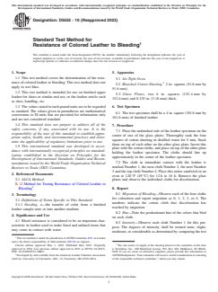 ASTM D5552-10(2023) is a standard published by ASTM International. Its full title is "Standard Test Method for Resistance of Colored Leather to Bleeding". This standard covers: SIGNIFICANCE AND USE 4.1 Bleed resistance is considered to be an important characteristic in leather used to make lined and unlined items that may come in contact with water. SCOPE 1.1 This test method covers the determination of the resistance of colored leather to bleeding. This test method does not apply to wet blue. 1.2 This test method is intended for use on finished upper leather for shoes or similar end use, or the leather article such as shoe, handbag, etc. 1.3 The values stated in inch-pound units are to be regarded as standard. The values given in parentheses are mathematical conversions to SI units that are provided for information only and are not considered standard. 1.4 This standard does not purport to address all of the safety concerns, if any, associated with its use. It is the responsibility of the user of this standard to establish appropriate safety, health, and environmental practices and determine the applicability of regulatory limitations prior to use. 1.5 This international standard was developed in accordance with internationally recognized principles on standardization established in the Decision on Principles for the Development of International Standards, Guides and Recommendations issued by the World Trade Organization Technical Barriers to Trade (TBT) Committee.
