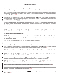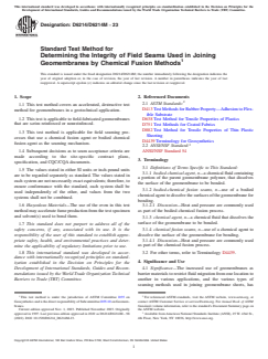 ASTM D6214/D6214M-23 is a standard published by ASTM International. Its full title is "Standard Test Method for Determining the Integrity of Field Seams Used in Joining Geomembranes by Chemical Fusion Methods". This standard covers: SIGNIFICANCE AND USE 4.1 Significance—The increased use of geomembranes as barrier materials to restrict fluid migration from one location to another in various applications, and the various types of seaming methods used in joining geomembrane sheets, has created a need to standardize tests by which the various seams can be compared and the quality of the seam systems can be evaluated. This test method is intended to meet such a need. 4.2 Use—Accelerated seam test provides information as to the status of the field seam. Data obtained by this test method should be used with site-specific contract plans, specification, and CQC/CQA documents. This test method is useful for specification testing and for comparative purposes, but does not necessarily measure the ultimate strength that the seam may acquire. SCOPE 1.1 This test method covers an accelerated, destructive test method for geomembranes in a geotechnical application. 1.2 This test is applicable to field-fabricated geomembranes that are scrim reinforced or nonreinforced. 1.3 This test method is applicable for field seaming processes that use a chemical fusion agent or bodied chemical fusion agent as the seaming mechanism. 1.4 Subsequent decisions as to seam acceptance criteria are made according to the site-specific contract plans, specification, and CQC/CQA documents. 1.5 The values stated in either SI units or inch-pound units are to be regarded separately as standard. The values stated in each system are not necessarily exact equivalents; therefore, to ensure conformance with the standard, each system shall be used independently of the other, and values from the two systems shall not be combined. 1.6 Hazardous Materials—The use of the oven in this test method may accelerate fume production from the test specimen and solvent(s) used to bond them. 1.7 This standard does not purport to address all of the safety concerns, if any, associated with its use. It is the responsibility of the user of this standard to establish appropriate safety, health, and environmental practices and determine the applicability of regulatory limitations prior to use. 1.8 This international standard was developed in accordance with internationally recognized principles on standardization established in the Decision on Principles for the Development of International Standards, Guides and Recommendations issued by the World Trade Organization Technical Barriers to Trade (TBT) Committee.