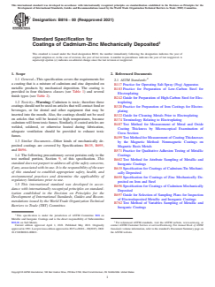 ASTM B816-00(2021) is a technical specification published by ASTM International. Its full title is "Standard Specification for Coatings of Cadmium-Zinc Mechanically Deposited". This standard covers: ABSTRACT This specification covers the requirements for cadmium-zinc coatings deposited on metallic products by mechanical deposition. The coating shall be classified in four thickness classes namely, Class 7, Class 12, Class 25, and Class 50. The coating shall also be classified according to coating types defined as Type I, Type IIa, Type IIb, Type IIc, and Type IId. The materials shall be subjected to the following test methods: coating composition determination; thickness measurement; adhesion test; corrosion resistance test; appearance test; and hydrogen embrittlement test. SIGNIFICANCE AND USE 6.1 Corrosion Resistance, General—This functional coating is used to provide corrosion resistance. The performance of this coating depends largely on its thickness and the kind of environment to which it is exposed. Published results of environmental corrosion studies have demonstrated that the coating provides corrosion resistance greater than equivalent thicknesses of zinc coatings in industrial environments and greater corrosion resistance than equivalent thicknesses of cadmium coatings in marine environments.4 6.2 Galvanic Corrosion Resistance—The galvanic couple that results in the corrosion of steel and aluminum parts in contact with each other in corrosive environments can also be minimized by plating the steel parts with this mechanically deposited coating. 6.3 Hydrogen Embrittlement, Absence of—The mechanical coating process does not produce any permanent hydrogen embrittlement in products made from high-strength steels, for example, fasteners or lock washers. SCOPE 1.1 General—This specification covers the requirements for a coating that is a mixture of cadmium and zinc deposited on metallic products by mechanical deposition. The coating is provided in four thickness classes (see Table 1) and several finish types (see Table 2). 1.2 Toxicity—Warning: Cadmium is toxic; therefore these coatings should not be used on articles that will contact food or beverages, or for dental and other equipment that may be inserted into the mouth. Also, the coatings should not be used on articles that will be heated to high temperatures, because cadmium will form toxic fumes. Similarly, if coated articles are welded, soldered, or otherwise heated during fabrication, adequate ventilation should be provided to exhaust toxic fumes. 1.3 Similar Documents—Other kinds of mechanically deposited coatings are covered by Specifications B635, B695, and B696. 1.4 The following precautionary caveat pertains only to the test method portion, Section 9, of this specification. This standard does not purport to address all of the safety concerns, if any, associated with its use. It is the responsibility of the user of this standard to establish appropriate safety, health, and environmental practices and determine the applicability of regulatory limitations prior to use. 1.5 This international standard was developed in accordance with internationally recognized principles on standardization established in the Decision on Principles for the Development of International Standards, Guides and Recommendations issued by the World Trade Organization Technical Barriers to Trade (TBT) Committee.